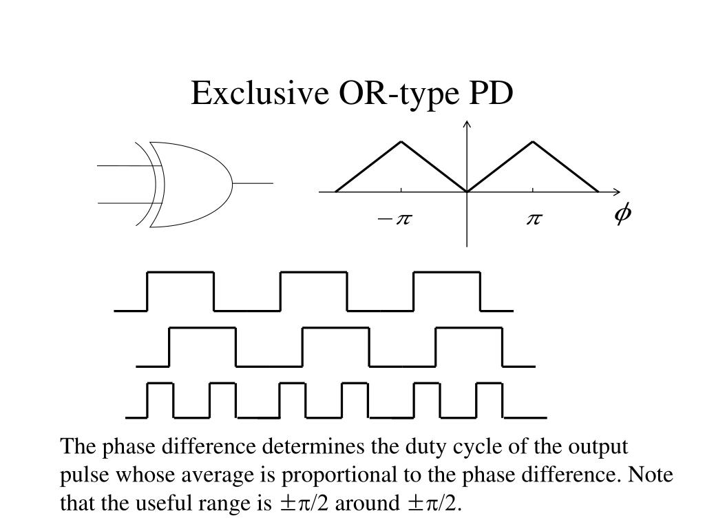 Exclusive OR-type PD The phase difference determines the duty cycle of the output pulse whose average is proportional to the phase difference. Note that the useful range is ±p/2 around ±p/2.