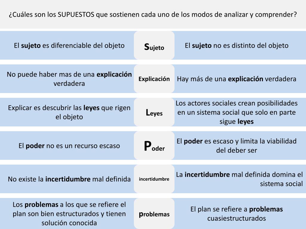 ¿Cuáles son los SUPUESTOS que sostienen cada uno de los modos de analizar y comprender? El sujeto es diferenciable del objeto sujeto El sujeto no es distinto del objeto No puede haber mas de una explicación verdadera Explicación Hay más de una explicación verdadera Explicar es descubrir las leyes que rigen el objeto Leyes Los actores sociales crean posibilidades en un sistema social que solo en parte sigue leyes El poder no es un recurso escaso Poder El poder es escaso y limita la viabilidad del deber ser No existe la incertidumbre mal definida incertidumbre La incertidumbre mal definida domina el sistema social Los problemas a los que se refiere el plan son bien estructurados y tienen solución conocida problemas El plan se refiere a problemas cuasiestructurados