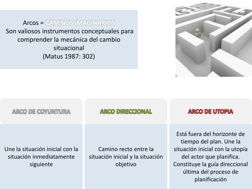 Arcos = CAMINOS IMAGINARIOS Son valiosos instrumentos conceptuales para comprender la mecánica del cambio situacional (Matus 1987: 302) ARCO DE COYUNTURA ARCO DIRECCIONAL ARCO DE UTOPIA Une la situación inicial con la situación inmediatamente siguiente Camino recto entre la situación inicial y la situación objetivo Está fuera del horizonte de tiempo del plan. Une la situación inicial con la utopía del actor que planifica. Constituye la guía direccional última del proceso de planificación