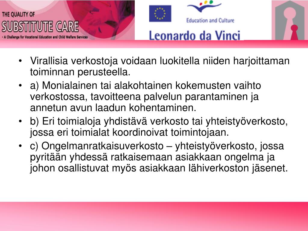 Virallisia verkostoja voidaan luokitella niiden harjoittaman toiminnan perusteella. • a) Monialainen tai alakohtainen kokemusten vaihto verkostossa, tavoitteena palvelun parantaminen ja annetun avun laadun kohentaminen. • b) Eri toimialoja yhdistävä verkosto tai yhteistyöverkosto, jossa eri toimialat koordinoivat toimintojaan. • c) Ongelmanratkaisuverkosto – yhteistyöverkosto, jossa pyritään yhdessä ratkaisemaan asiakkaan ongelma ja johon osallistuvat myös asiakkaan lähiverkoston jäsenet.