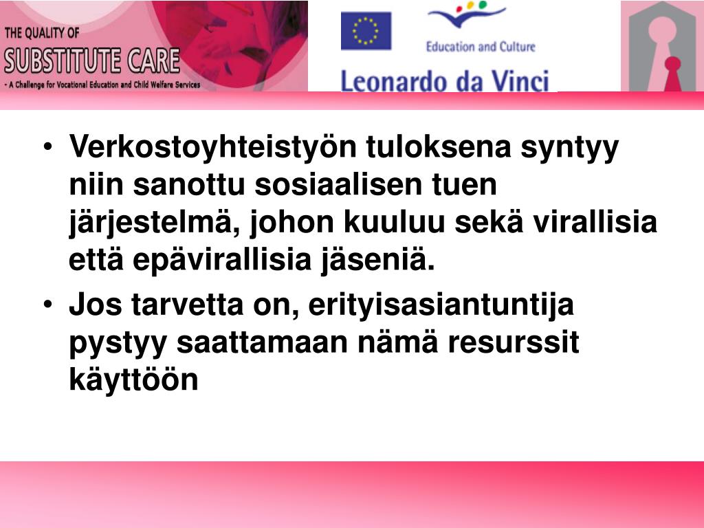 Verkostoyhteistyön tuloksena syntyy niin sanottu sosiaalisen tuen järjestelmä, johon kuuluu sekä virallisia että epävirallisia jäseniä. • Jos tarvetta on, erityisasiantuntija pystyy saattamaan nämä resurssit käyttöön