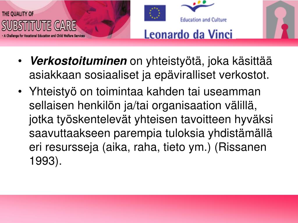 Verkostoituminen on yhteistyötä, joka käsittää asiakkaan sosiaaliset ja epäviralliset verkostot. • Yhteistyö on toimintaa kahden tai useamman sellaisen henkilön ja/tai organisaation välillä, jotka työskentelevät yhteisen tavoitteen hyväksi saavuttaakseen parempia tuloksia yhdistämällä eri resursseja (aika, raha, tieto ym.) (Rissanen 1993).