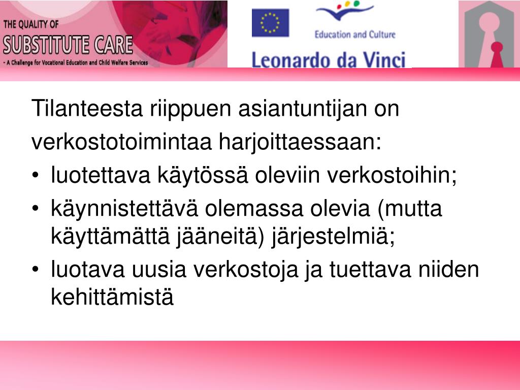 Tilanteesta riippuen asiantuntijan on verkostotoimintaa harjoittaessaan: • luotettava käytössä oleviin verkostoihin; • käynnistettävä olemassa olevia (mutta käyttämättä jääneitä) järjestelmiä; • luotava uusia verkostoja ja tuettava niiden kehittämistä