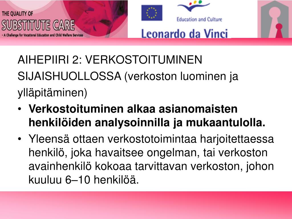 AIHEPIIRI 2:VERKOSTOITUMINEN SIJAISHUOLLOSSA (verkoston luominen ja ylläpitäminen) • Verkostoituminen alkaa asianomaisten henkilöiden analysoinnilla ja mukaantulolla. • Yleensä ottaen verkostotoimintaa harjoitettaessa henkilö, joka havaitsee ongelman, tai verkoston avainhenkilö kokoaa tarvittavan verkoston, johon kuuluu 6–10 henkilöä.