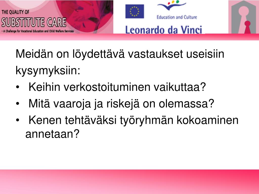 Meidän on löydettävä vastaukset useisiin kysymyksiin: • Keihin verkostoituminen vaikuttaa? • Mitä vaaroja ja riskejä on olemassa? • Kenen tehtäväksi työryhmän kokoaminen annetaan?