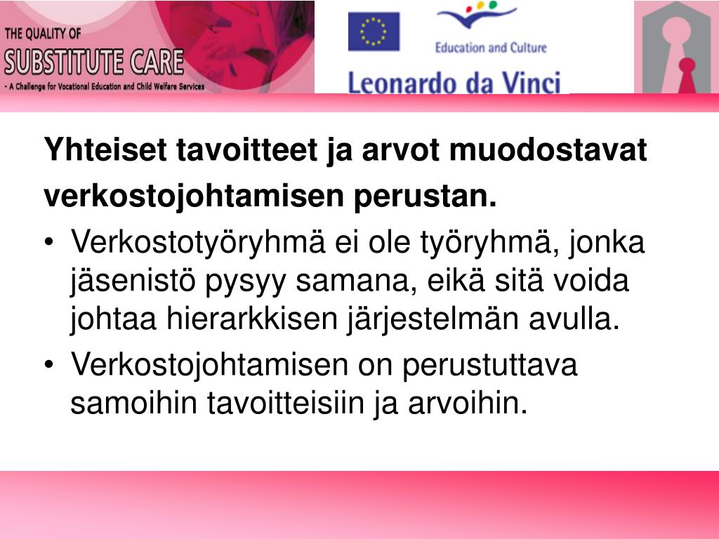 Yhteiset tavoitteet ja arvot muodostavat verkostojohtamisen perustan. • Verkostotyöryhmä ei ole työryhmä, jonka jäsenistö pysyy samana, eikä sitä voida johtaa hierarkkisen järjestelmän avulla. • Verkostojohtamisen on perustuttava samoihin tavoitteisiin ja arvoihin.