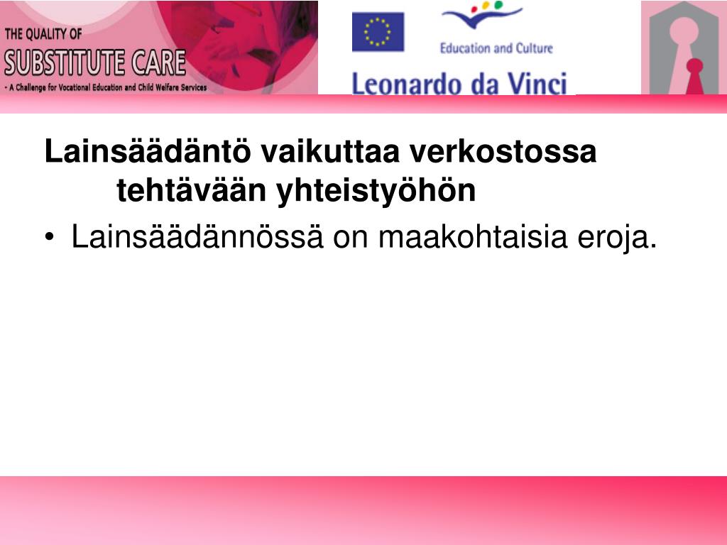 Lainsäädäntö vaikuttaa verkostossa tehtävään yhteistyöhön • Lainsäädännössä on maakohtaisia eroja.
