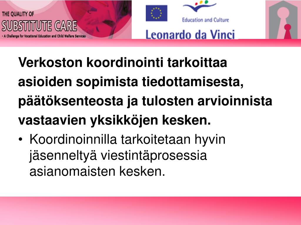Verkoston koordinointi tarkoittaa asioiden sopimista tiedottamisesta, päätöksenteosta ja tulosten arvioinnista vastaavien yksikköjen kesken. • Koordinoinnilla tarkoitetaan hyvin jäsenneltyä viestintäprosessia asianomaisten kesken.