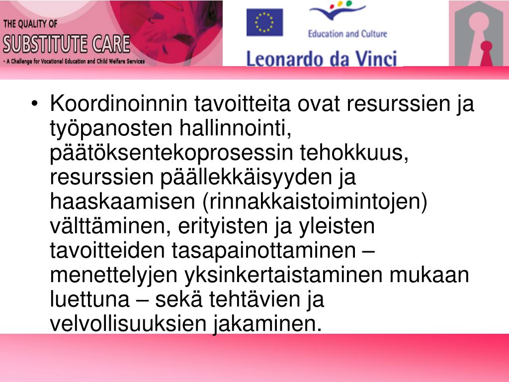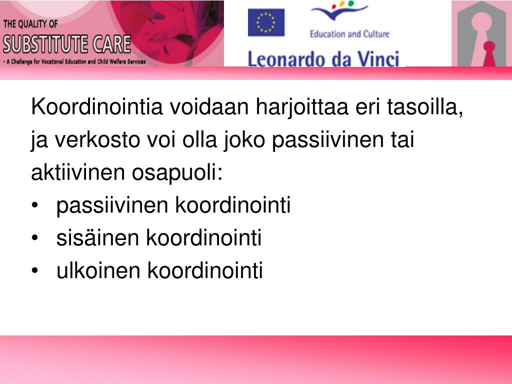 Koordinointia voidaan harjoittaa eri tasoilla, ja verkosto voi olla joko passiivinen tai aktiivinen osapuoli: • passiivinen koordinointi • sisäinen koordinointi • ulkoinen koordinointi