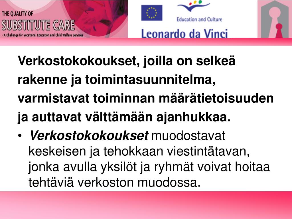 Verkostokokoukset, joilla on selkeä rakenne ja toimintasuunnitelma, varmistavat toiminnan määrätietoisuuden ja auttavat välttämään ajanhukkaa. • Verkostokokoukset muodostavat keskeisen ja tehokkaan viestintätavan, jonka avulla yksilöt ja ryhmät voivat hoitaa tehtäviä verkoston muodossa.
