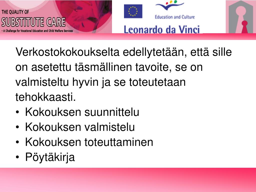 Verkostokokoukselta edellytetään, että sille on asetettu täsmällinen tavoite, se on valmisteltu hyvin ja se toteutetaan tehokkaasti. • Kokouksen suunnittelu • Kokouksen valmistelu • Kokouksen toteuttaminen • Pöytäkirja