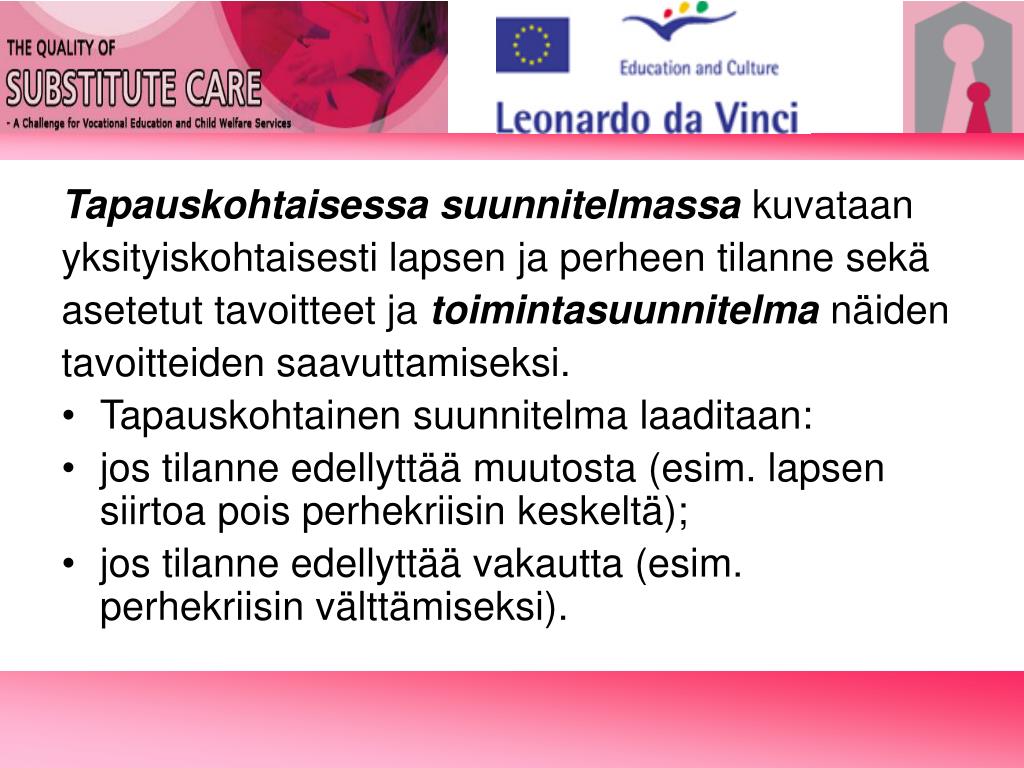Tapauskohtaisessa suunnitelmassa kuvataan yksityiskohtaisesti lapsen ja perheen tilanne sekä asetetut tavoitteet ja toimintasuunnitelma näiden tavoitteiden saavuttamiseksi. • Tapauskohtainen suunnitelma laaditaan: • jos tilanne edellyttää muutosta (esim. lapsen siirtoa pois perhekriisin keskeltä); • jos tilanne edellyttää vakautta (esim. perhekriisin välttämiseksi).