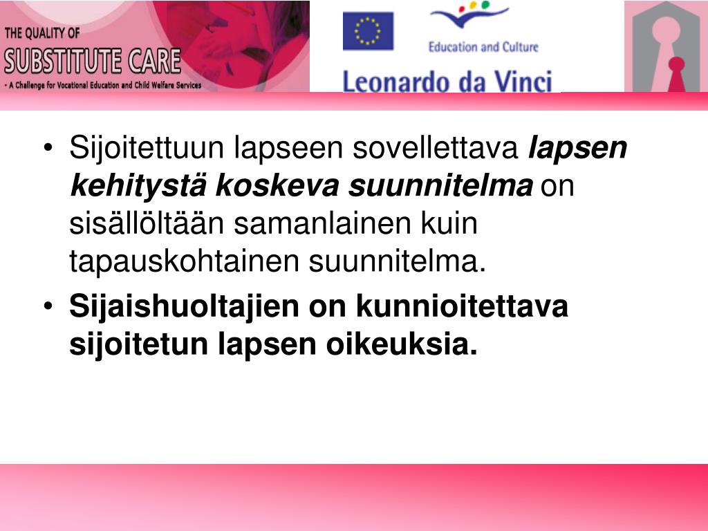 Sijoitettuun lapseen sovellettava lapsen kehitystä koskeva suunnitelma on sisällöltään samanlainen kuin tapauskohtainen suunnitelma. • Sijaishuoltajien on kunnioitettava sijoitetun lapsen oikeuksia.