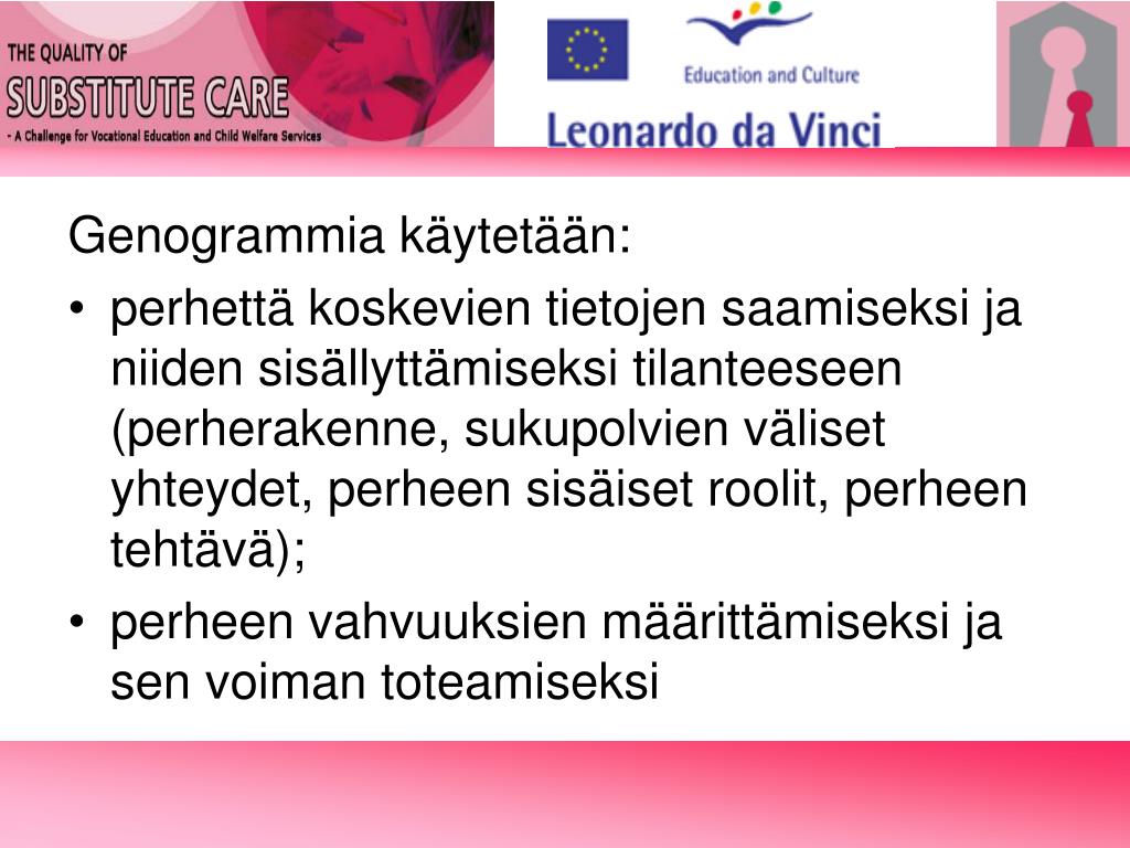 Genogrammia käytetään: • perhettä koskevien tietojen saamiseksi ja niiden sisällyttämiseksi tilanteeseen (perherakenne, sukupolvien väliset yhteydet, perheen sisäiset roolit, perheen tehtävä); • perheen vahvuuksien määrittämiseksi ja sen voiman toteamiseksi