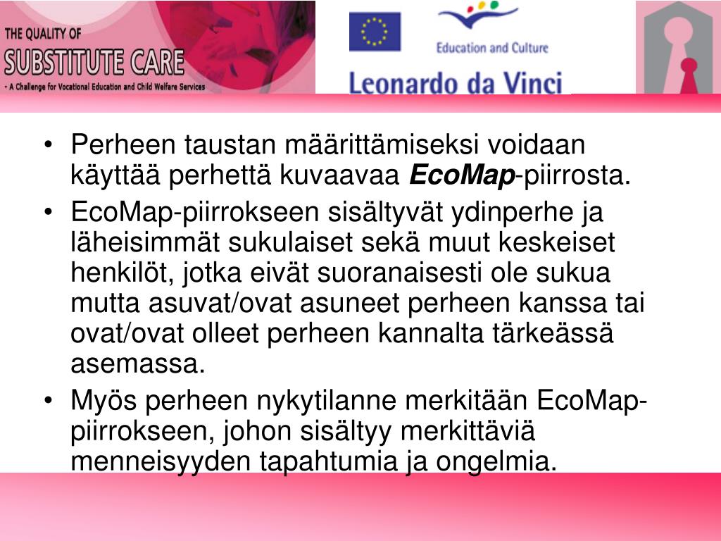 Perheen taustan määrittämiseksi voidaan käyttää perhettä kuvaavaa EcoMap-piirrosta. • EcoMap-piirrokseen sisältyvät ydinperhe ja läheisimmät sukulaiset sekä muut keskeiset henkilöt, jotka eivät suoranaisesti ole sukua mutta asuvat/ovat asuneet perheen kanssa tai ovat/ovat olleet perheen kannalta tärkeässä asemassa. • Myös perheen nykytilanne merkitään EcoMap-piirrokseen, johon sisältyy merkittäviä menneisyyden tapahtumia ja ongelmia.