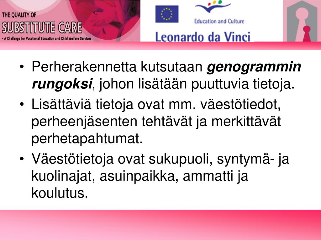 Perherakennetta kutsutaan genogrammin rungoksi, johon lisätään puuttuvia tietoja. • Lisättäviä tietoja ovat mm. väestötiedot, perheenjäsenten tehtävät ja merkittävät perhetapahtumat. • Väestötietoja ovat sukupuoli, syntymä- ja kuolinajat, asuinpaikka, ammatti ja koulutus.