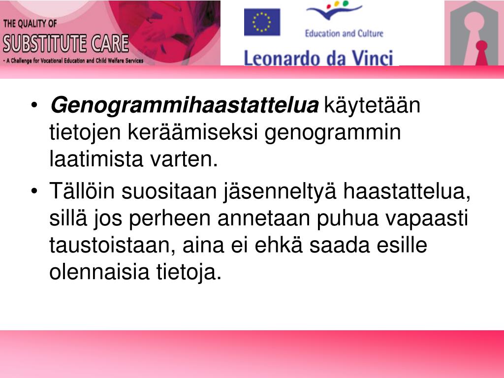 Genogrammihaastattelua käytetään tietojen keräämiseksi genogrammin laatimista varten. • Tällöin suositaan jäsenneltyä haastattelua, sillä jos perheen annetaan puhua vapaasti taustoistaan, aina ei ehkä saada esille olennaisia tietoja.