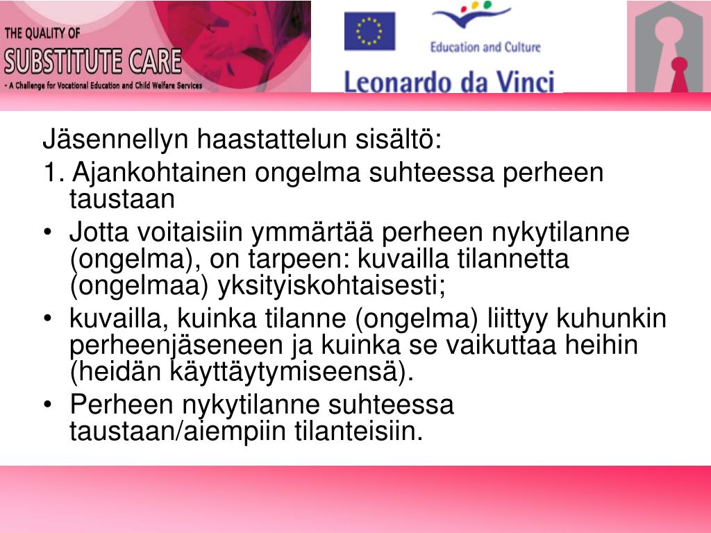 Jäsennellyn haastattelun sisältö: 1. Ajankohtainen ongelma suhteessa perheen taustaan • Jotta voitaisiin ymmärtää perheen nykytilanne (ongelma), on tarpeen:kuvailla tilannetta (ongelmaa) yksityiskohtaisesti; • kuvailla, kuinka tilanne (ongelma) liittyy kuhunkin perheenjäseneen ja kuinka se vaikuttaa heihin (heidän käyttäytymiseensä). • Perheen nykytilanne suhteessa taustaan/aiempiin tilanteisiin.