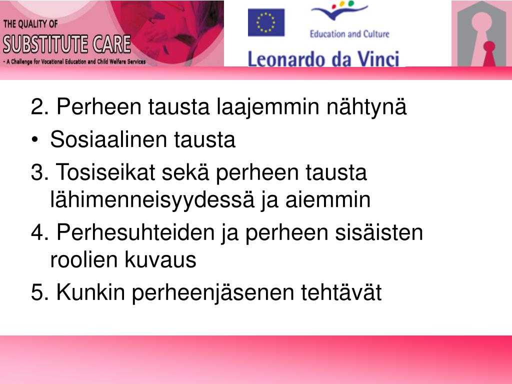 2. Perheen tausta laajemmin nähtynä • Sosiaalinen tausta 3. Tosiseikat sekä perheen tausta lähimenneisyydessä ja aiemmin 4. Perhesuhteiden ja perheen sisäisten roolien kuvaus 5. Kunkin perheenjäsenen tehtävät