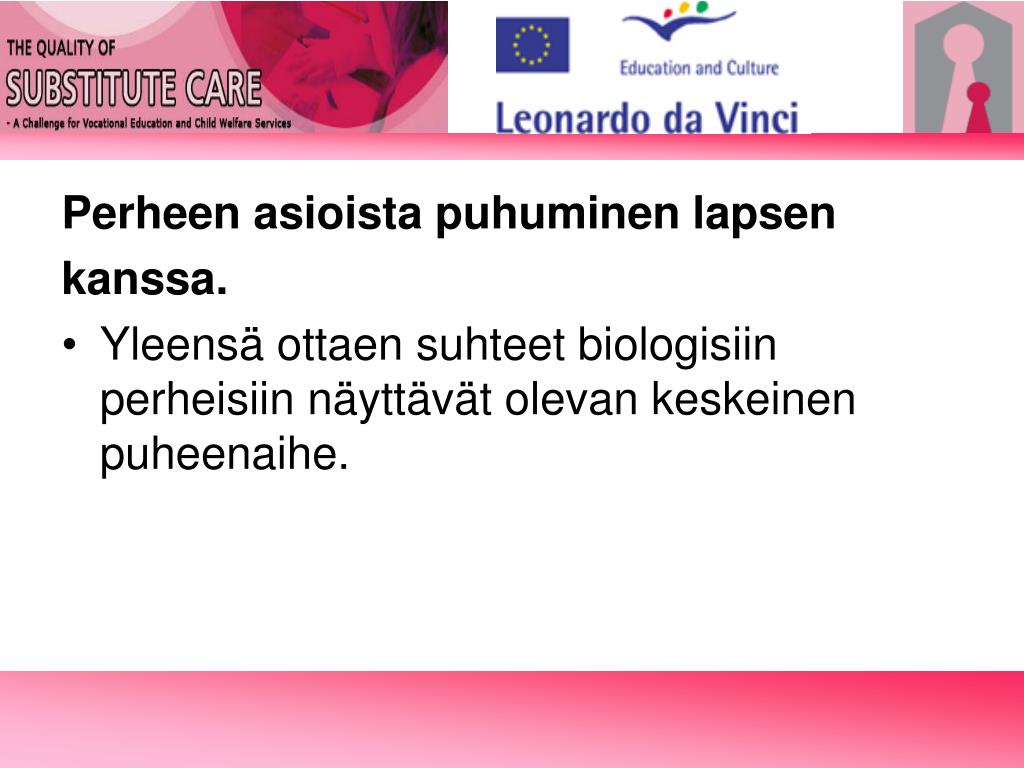Perheen asioista puhuminen lapsen kanssa. • Yleensä ottaen suhteet biologisiin perheisiin näyttävät olevan keskeinen puheenaihe.