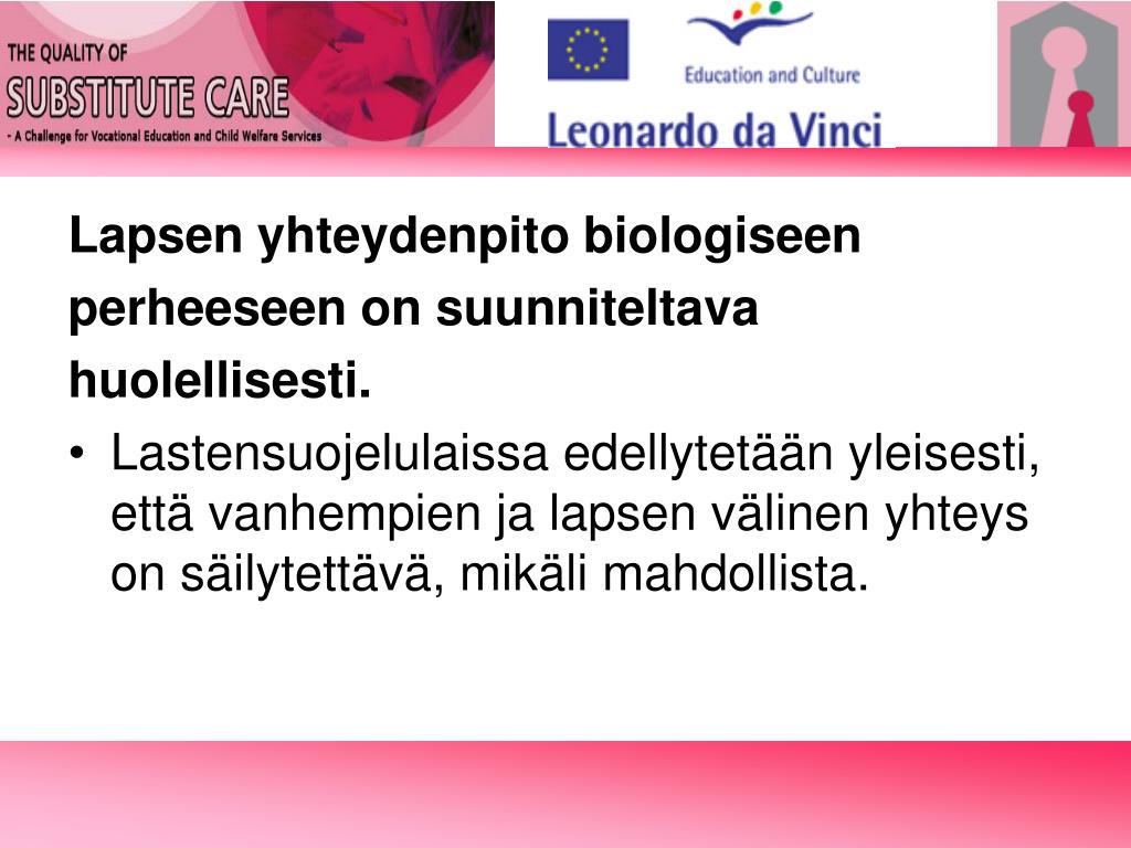 Lapsen yhteydenpito biologiseen perheeseen on suunniteltava huolellisesti. • Lastensuojelulaissa edellytetään yleisesti, että vanhempien ja lapsen välinen yhteys on säilytettävä, mikäli mahdollista.