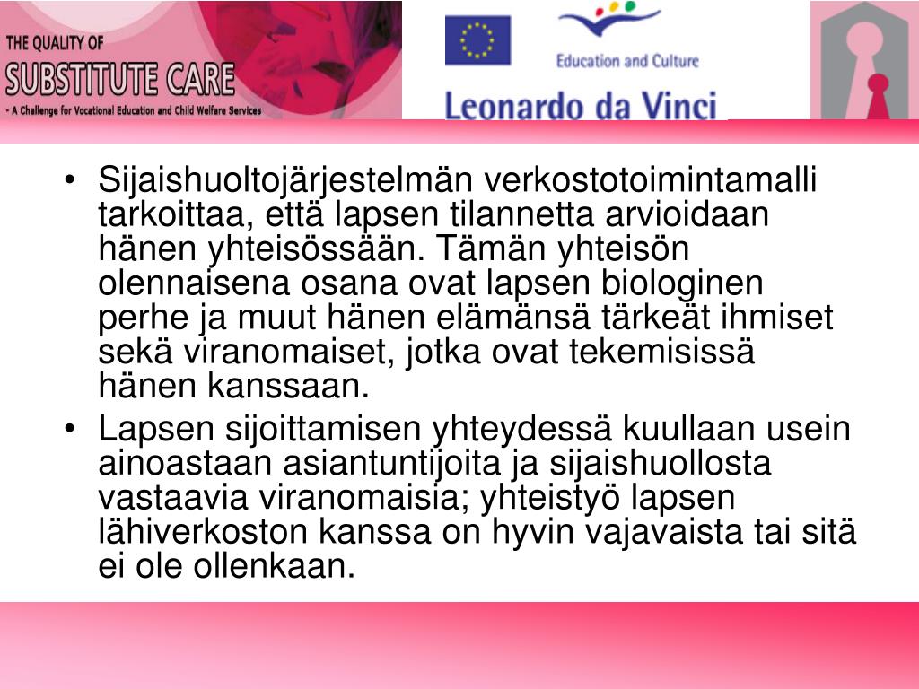 Sijaishuoltojärjestelmän verkostotoimintamalli tarkoittaa, että lapsen tilannetta arvioidaan hänen yhteisössään.Tämän yhteisön olennaisena osana ovat lapsen biologinen perhe ja muut hänen elämänsä tärkeät ihmiset sekä viranomaiset, jotka ovat tekemisissä hänen kanssaan. • Lapsen sijoittamisen yhteydessä kuullaan usein ainoastaan asiantuntijoita ja sijaishuollosta vastaavia viranomaisia; yhteistyö lapsen lähiverkoston kanssa on hyvin vajavaista tai sitä ei ole ollenkaan.
