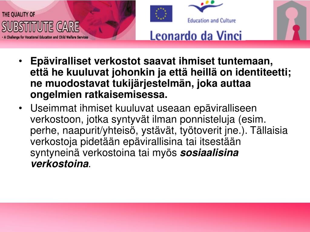 Epäviralliset verkostot saavat ihmiset tuntemaan, että he kuuluvat johonkin ja että heillä on identiteetti; ne muodostavat tukijärjestelmän, joka auttaa ongelmien ratkaisemisessa. • Useimmat ihmiset kuuluvat useaan epäviralliseen verkostoon, jotka syntyvät ilman ponnisteluja (esim. perhe, naapurit/yhteisö, ystävät, työtoverit jne.).Tällaisia verkostoja pidetään epävirallisina tai itsestään syntyneinä verkostoina tai myös sosiaalisina verkostoina.