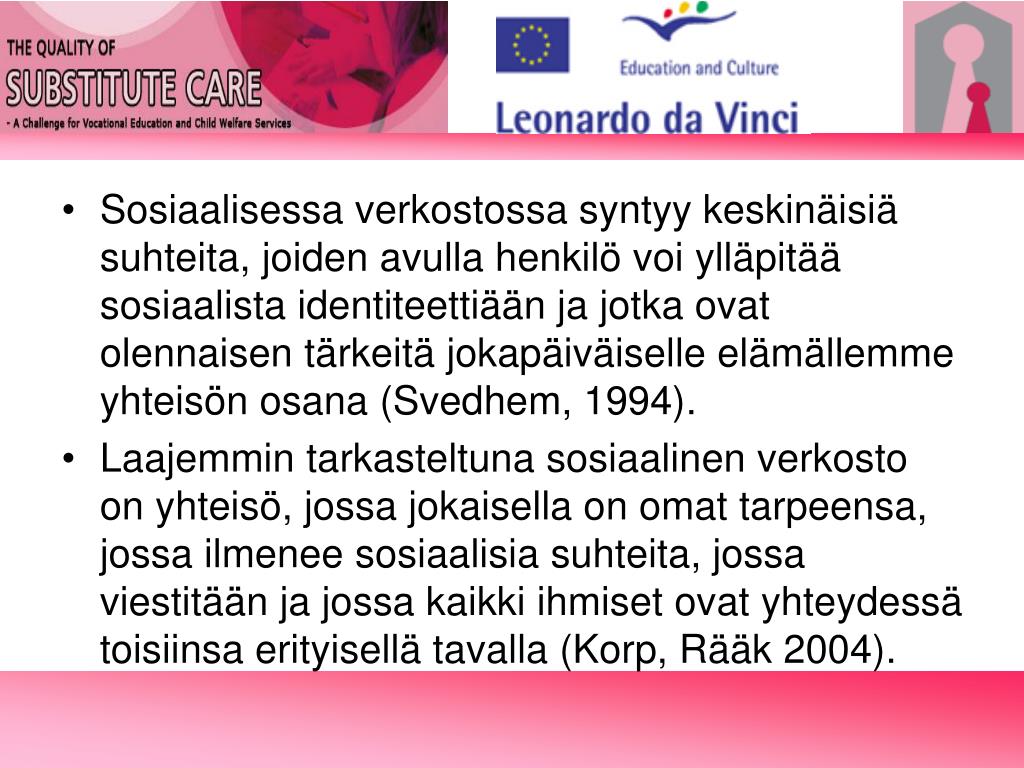 Sosiaalisessa verkostossa syntyy keskinäisiä suhteita, joiden avulla henkilö voi ylläpitää sosiaalista identiteettiään ja jotka ovat olennaisen tärkeitä jokapäiväiselle elämällemme yhteisön osana (Svedhem, 1994). • Laajemmin tarkasteltuna sosiaalinen verkosto on yhteisö, jossa jokaisella on omat tarpeensa, jossa ilmenee sosiaalisia suhteita, jossa viestitään ja jossa kaikki ihmiset ovat yhteydessä toisiinsa erityisellä tavalla (Korp, Rääk 2004).