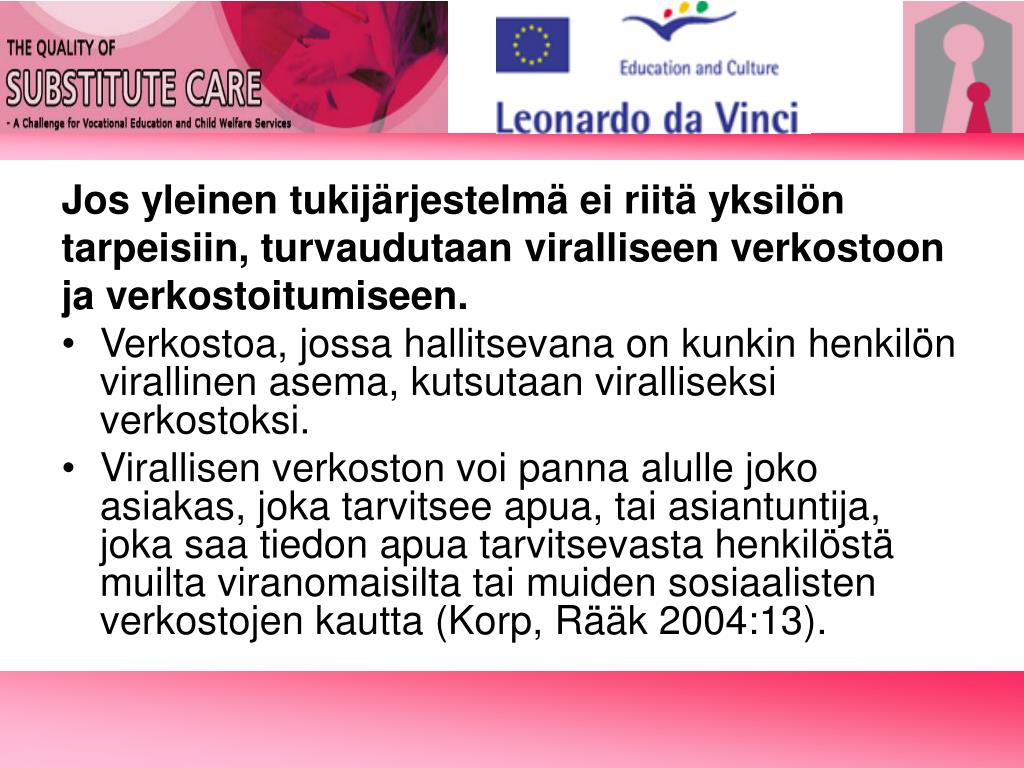 Jos yleinen tukijärjestelmä ei riitä yksilön tarpeisiin, turvaudutaan viralliseen verkostoon ja verkostoitumiseen. • Verkostoa, jossa hallitsevana on kunkin henkilön virallinen asema, kutsutaan viralliseksi verkostoksi. • Virallisen verkoston voi panna alulle joko asiakas, joka tarvitsee apua, tai asiantuntija, joka saa tiedon apua tarvitsevasta henkilöstä muilta viranomaisilta tai muiden sosiaalisten verkostojen kautta (Korp, Rääk 2004:13).