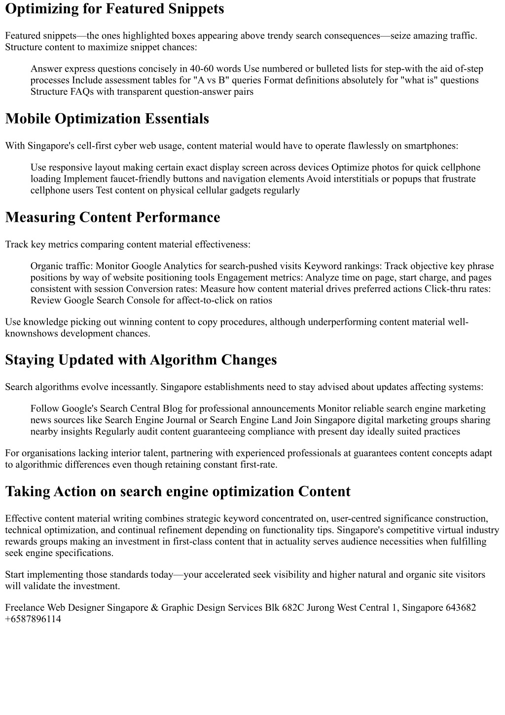 Optimizing for Featured Snippets Featured snippets—the ones highlighted boxes appearing above trendy search consequences—seize amazing traffic. Structure content to maximize snippet chances: Answer express questions concisely in 40-60 words Use numbered or bulleted lists for step-with the aid of-step processes Include assessment tables for "A vs B" queries Format definitions absolutely for "what is" questions Structure FAQs with transparent question-answer pairs Mobile Optimization Essentials With Singapore's cell-first cyber web usage, content material would have to operate flawlessly on smartphones: Use responsive layout making certain exact display screen across devices Optimize photos for quick cellphone loading Implement faucet-friendly buttons and navigation elements Avoid interstitials or popups that frustrate cellphone users Test content on physical cellular gadgets regularly Measuring Content Performance Track key metrics comparing content material effectiveness: Organic traffic: Monitor Google Analytics for search-pushed visits Keyword rankings: Track objective key phrase positions by way of website positioning tools Engagement metrics: Analyze time on page, start charge, and pages consistent with session Conversion rates: Measure how content material drives preferred actions Click-thru rates: Review Google Search Console for affect-to-click on ratios Use knowledge picking out winning content to copy procedures, although underperforming content material well- knownshows development chances. Staying Updated with Algorithm Changes Search algorithms evolve incessantly. Singapore establishments need to stay advised about updates affecting systems: Follow Google's Search Central Blog for professional announcements Monitor reliable search engine marketing news sources like Search Engine Journal or Search Engine Land Join Singapore digital marketing groups sharing nearby insights Regularly audit content guaranteeing compliance with present day ideally suited practices For organisations lacking interior talent, partnering with experienced professionals at guarantees content concepts adapt to algorithmic differences even though retaining constant first-rate. Taking Action on search engine optimization Content Effective content material writing combines strategic keyword concentrated on, user-centred significance construction, technical optimization, and continual refinement depending on functionality tips. Singapore's competitive virtual industry rewards groups making an investment in first-class content that in actuality serves audience necessities when fulfilling seek engine specifications. Start implementing those standards today—your accelerated seek visibility and higher natural and organic site visitors will validate the investment. Freelance Web Designer Singapore & Graphic Design Services Blk 682C Jurong West Central 1, Singapore 643682 +6587896114