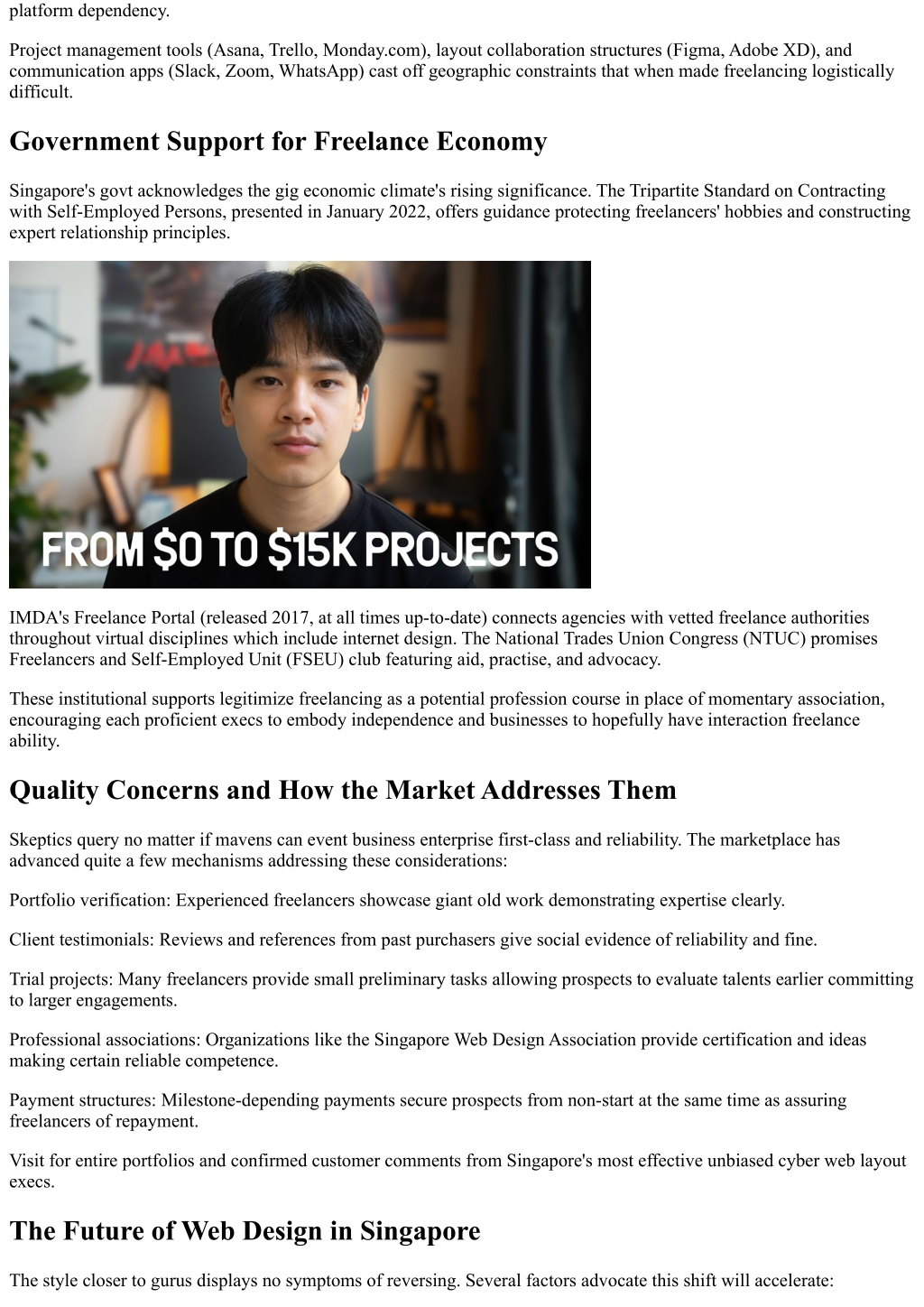 platform dependency. Project management tools (Asana, Trello, Monday.com), layout collaboration structures (Figma, Adobe XD), and communication apps (Slack, Zoom, WhatsApp) cast off geographic constraints that when made freelancing logistically difficult. Government Support for Freelance Economy Singapore's govt acknowledges the gig economic climate's rising significance. The Tripartite Standard on Contracting with Self-Employed Persons, presented in January 2022, offers guidance protecting freelancers' hobbies and constructing expert relationship principles. IMDA's Freelance Portal (released 2017, at all times up-to-date) connects agencies with vetted freelance authorities throughout virtual disciplines which include internet design. The National Trades Union Congress (NTUC) promises Freelancers and Self-Employed Unit (FSEU) club featuring aid, practise, and advocacy. These institutional supports legitimize freelancing as a potential profession course in place of momentary association, encouraging each proficient execs to embody independence and businesses to hopefully have interaction freelance ability. Quality Concerns and How the Market Addresses Them Skeptics query no matter if mavens can event business enterprise first-class and reliability. The marketplace has advanced quite a few mechanisms addressing these considerations: Portfolio verification: Experienced freelancers showcase giant old work demonstrating expertise clearly. Client testimonials: Reviews and references from past purchasers give social evidence of reliability and fine. Trial projects: Many freelancers provide small preliminary tasks allowing prospects to evaluate talents earlier committing to larger engagements. Professional associations: Organizations like the Singapore Web Design Association provide certification and ideas making certain reliable competence. Payment structures: Milestone-depending payments secure prospects from non-start at the same time as assuring freelancers of repayment. Visit for entire portfolios and confirmed customer comments from Singapore's most effective unbiased cyber web layout execs. The Future of Web Design in Singapore The style closer to gurus displays no symptoms of reversing. Several factors advocate this shift will accelerate: