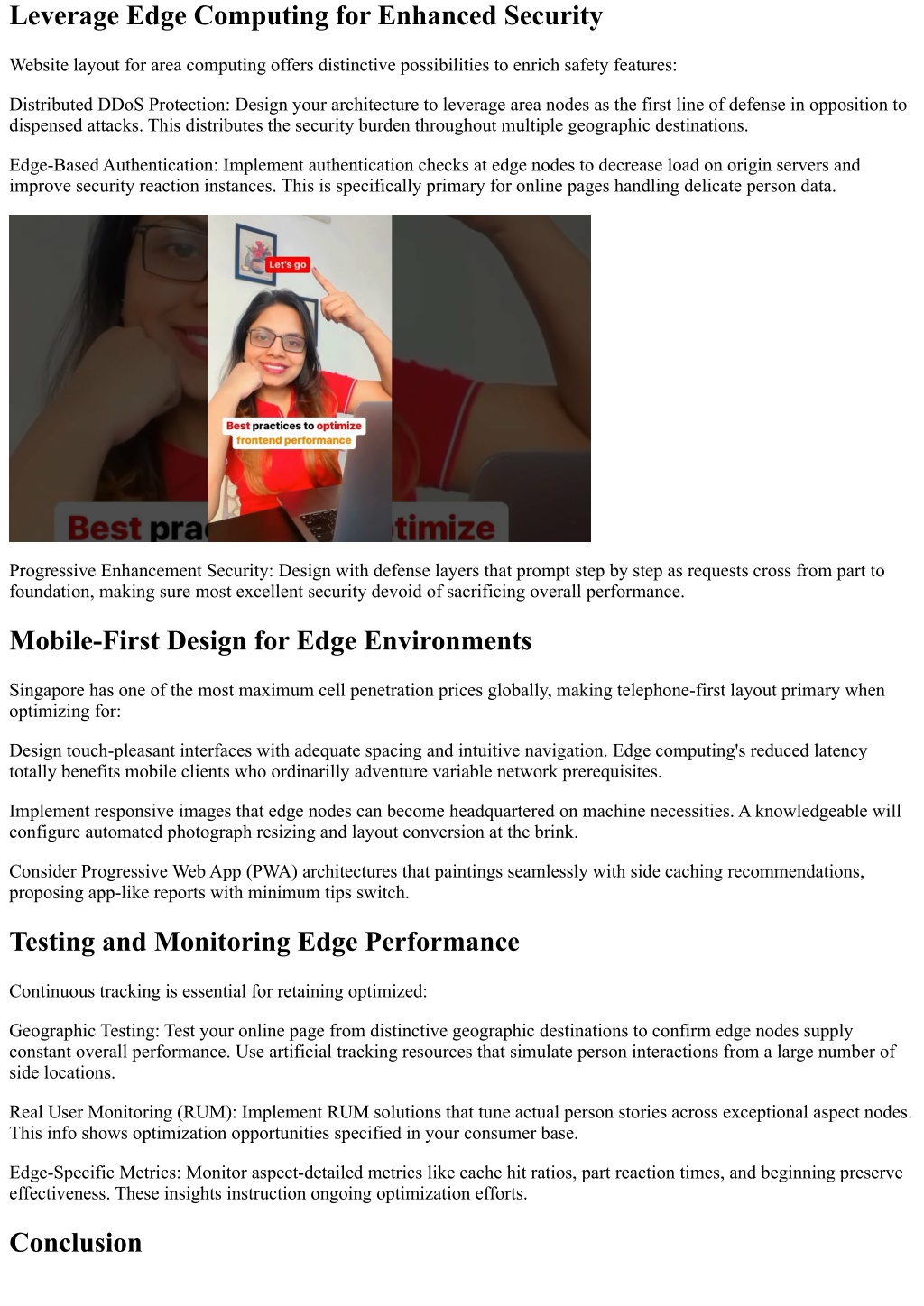 Leverage Edge Computing for Enhanced Security Website layout for area computing offers distinctive possibilities to enrich safety features: Distributed DDoS Protection: Design your architecture to leverage area nodes as the first line of defense in opposition to dispensed attacks. This distributes the security burden throughout multiple geographic destinations. Edge-Based Authentication: Implement authentication checks at edge nodes to decrease load on origin servers and improve security reaction instances. This is specifically primary for online pages handling delicate person data. Progressive Enhancement Security: Design with defense layers that prompt step by step as requests cross from part to foundation, making sure most excellent security devoid of sacrificing overall performance. Mobile-First Design for Edge Environments Singapore has one of the most maximum cell penetration prices globally, making telephone-first layout primary when optimizing for: Design touch-pleasant interfaces with adequate spacing and intuitive navigation. Edge computing's reduced latency totally benefits mobile clients who ordinarilly adventure variable network prerequisites. Implement responsive images that edge nodes can become headquartered on machine necessities. A knowledgeable will configure automated photograph resizing and layout conversion at the brink. Consider Progressive Web App (PWA) architectures that paintings seamlessly with side caching recommendations, proposing app-like reports with minimum tips switch. Testing and Monitoring Edge Performance Continuous tracking is essential for retaining optimized: Geographic Testing: Test your online page from distinctive geographic destinations to confirm edge nodes supply constant overall performance. Use artificial tracking resources that simulate person interactions from a large number of side locations. Real User Monitoring (RUM): Implement RUM solutions that tune actual person stories across exceptional aspect nodes. This info shows optimization opportunities specified in your consumer base. Edge-Specific Metrics: Monitor aspect-detailed metrics like cache hit ratios, part reaction times, and beginning preserve effectiveness. These insights instruction ongoing optimization efforts. Conclusion