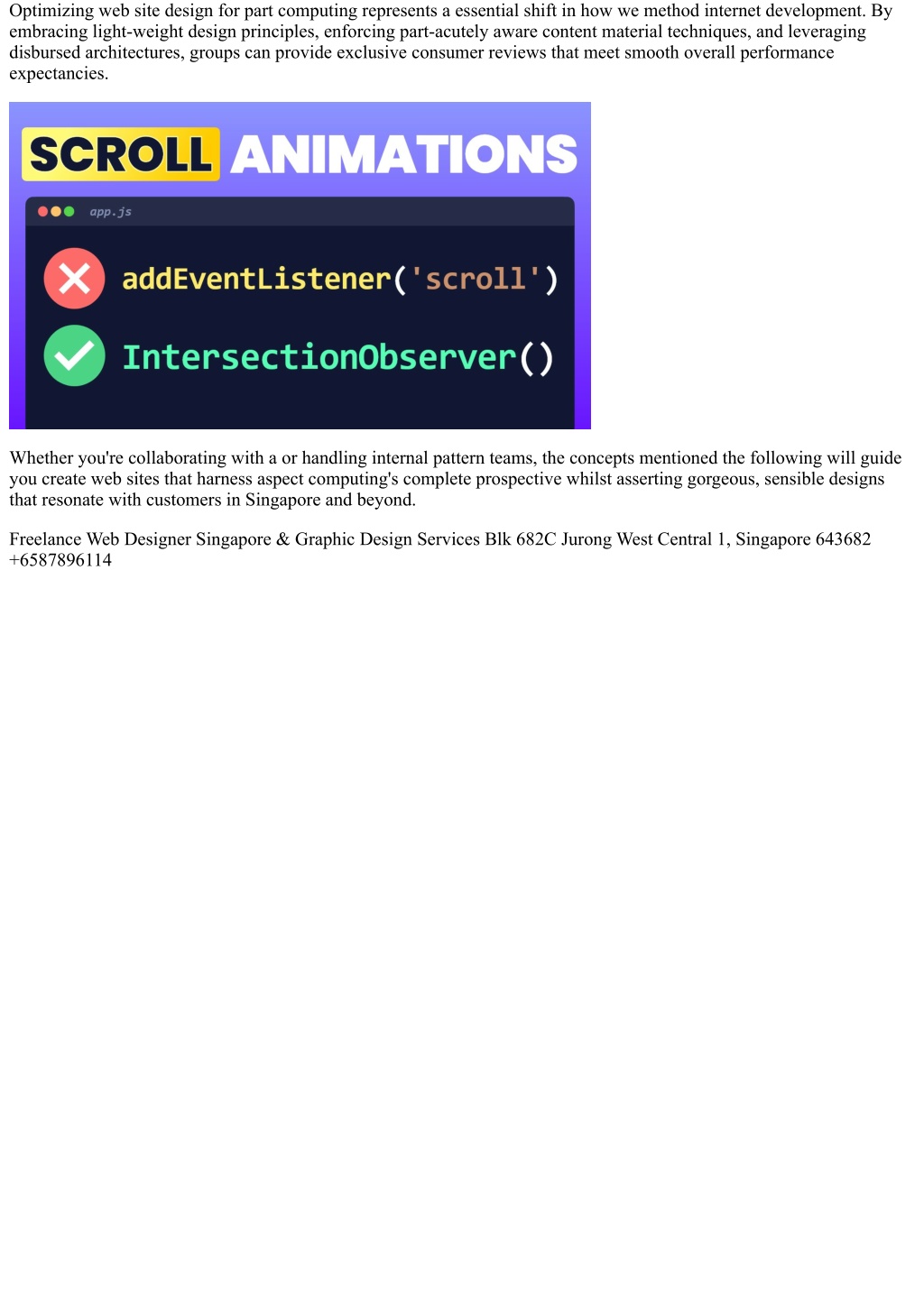 Optimizing web site design for part computing represents a essential shift in how we method internet development. By embracing light-weight design principles, enforcing part-acutely aware content material techniques, and leveraging disbursed architectures, groups can provide exclusive consumer reviews that meet smooth overall performance expectancies. Whether you're collaborating with a or handling internal pattern teams, the concepts mentioned the following will guide you create web sites that harness aspect computing's complete prospective whilst asserting gorgeous, sensible designs that resonate with customers in Singapore and beyond. Freelance Web Designer Singapore & Graphic Design Services Blk 682C Jurong West Central 1, Singapore 643682 +6587896114
