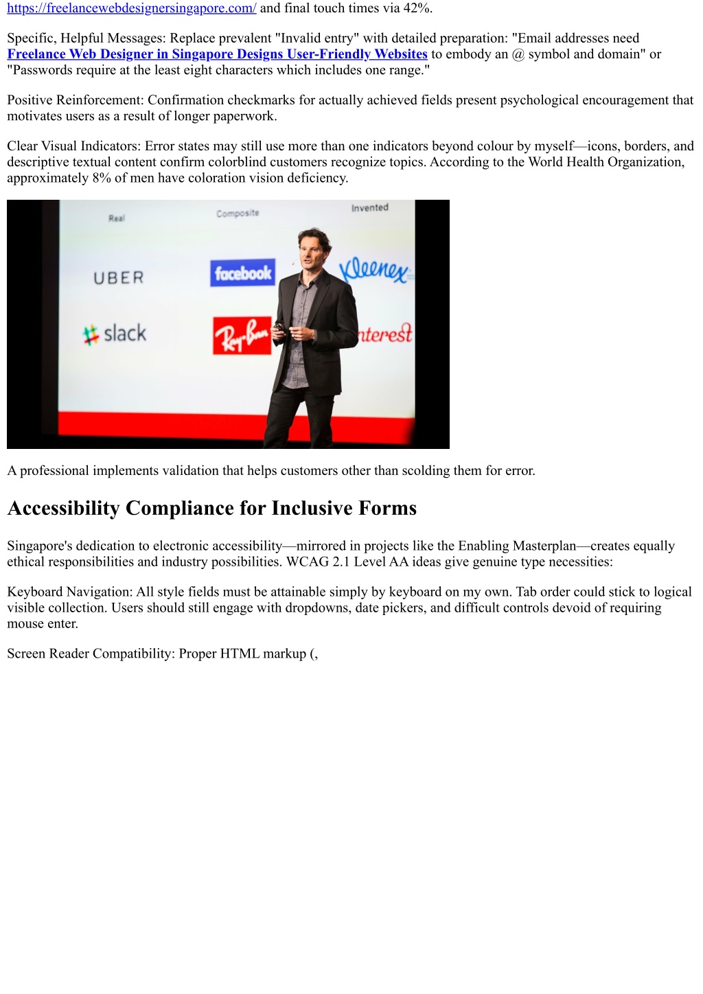 https://freelancewebdesignersingapore.com/ and final touch times via 42%. Specific, Helpful Messages: Replace prevalent "Invalid entry" with detailed preparation: "Email addresses need Freelance Web Designer in Singapore Designs User-Friendly Websites to embody an @ symbol and domain" or "Passwords require at the least eight characters which includes one range." Positive Reinforcement: Confirmation checkmarks for actually achieved fields present psychological encouragement that motivates users as a result of longer paperwork. Clear Visual Indicators: Error states may still use more than one indicators beyond colour by myself—icons, borders, and descriptive textual content confirm colorblind customers recognize topics. According to the World Health Organization, approximately 8% of men have coloration vision deficiency. A professional implements validation that helps customers other than scolding them for error. Accessibility Compliance for Inclusive Forms Singapore's dedication to electronic accessibility—mirrored in projects like the Enabling Masterplan—creates equally ethical responsibilities and industry possibilities. WCAG 2.1 Level AA ideas give genuine type necessities: Keyboard Navigation: All style fields must be attainable simply by keyboard on my own. Tab order could stick to logical visible collection. Users should still engage with dropdowns, date pickers, and difficult controls devoid of requiring mouse enter. Screen Reader Compatibility: Proper HTML markup (,