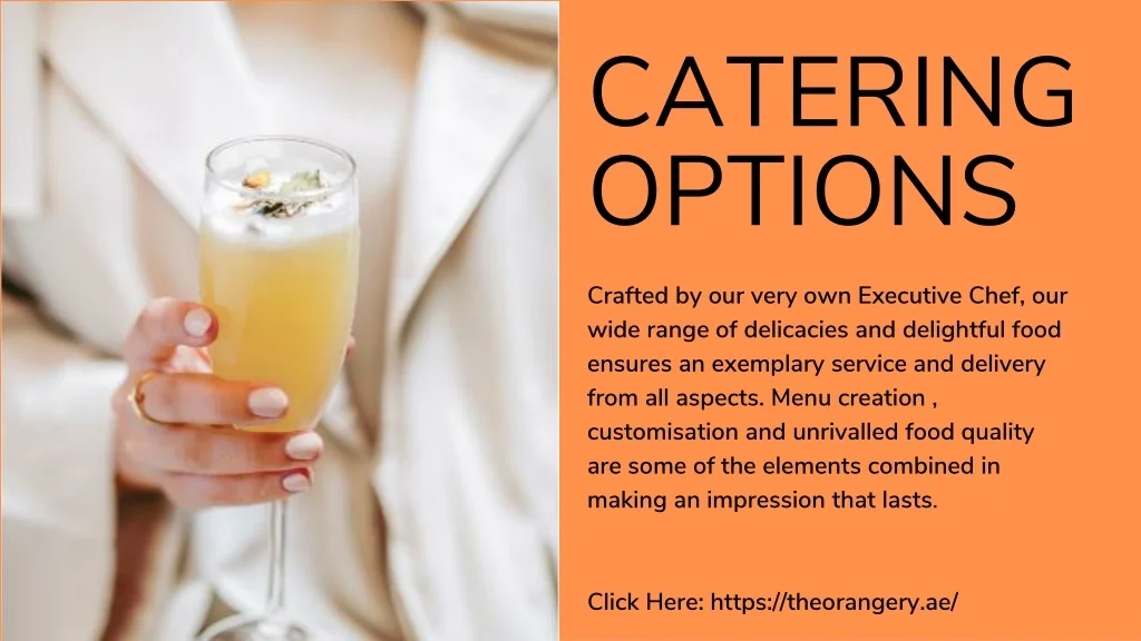 CATERING OPTIONS Crafted by our very own Executive Chef, our wide range of delicacies and delightful food ensures an exemplary service and delivery from all aspects. Menu creation , customisation and unrivalled food quality are some of the elements combined in making an impression that lasts. Click Here: https://theorangery.ae/