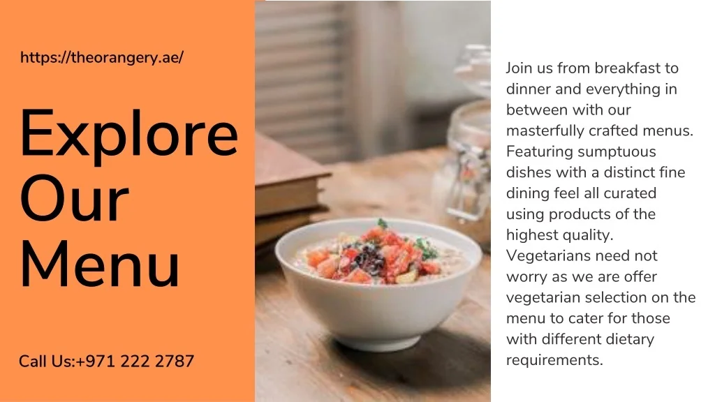 https://theorangery.ae/ Join us from breakfast to dinner and everything in between with our masterfully crafted menus. Featuring sumptuous dishes with a distinct fine dining feel all curated using products of the highest quality. Vegetarians need not worry as we are offer vegetarian selection on the menu to cater for those with different dietary requirements. Explore Our Menu Call Us:+971 222 2787