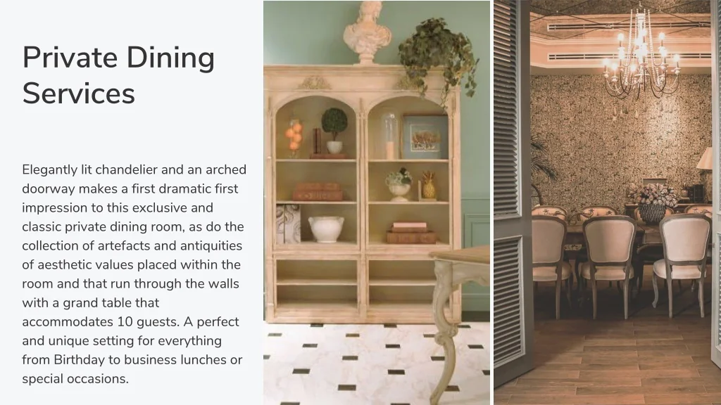 Private Dining Services Elegantly lit chandelier and an arched doorway makes a first dramatic first impression to this exclusive and classic private dining room, as do the collection of artefacts and antiquities of aesthetic values placed within the room and that run through the walls with a grand table that accommodates 10 guests. A perfect and unique setting for everything from Birthday to business lunches or special occasions.