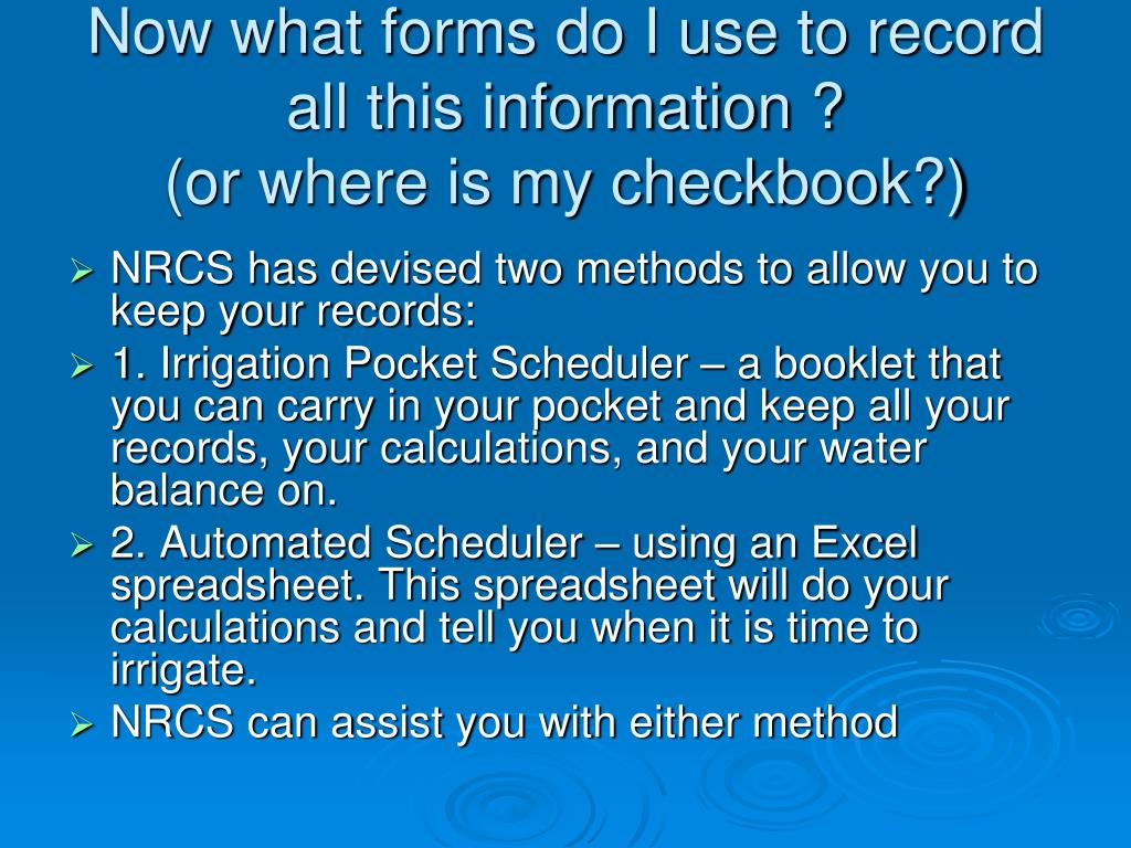 Now what forms do I use to record all this information ?(or where is my checkbook?) • NRCS has devised two methods to allow you to keep your records: • 1. Irrigation Pocket Scheduler – a booklet that you can carry in your pocket and keep all your records, your calculations, and your water balance on. • 2. Automated Scheduler – using an Excel spreadsheet. This spreadsheet will do your calculations and tell you when it is time to irrigate. • NRCS can assist you with either method