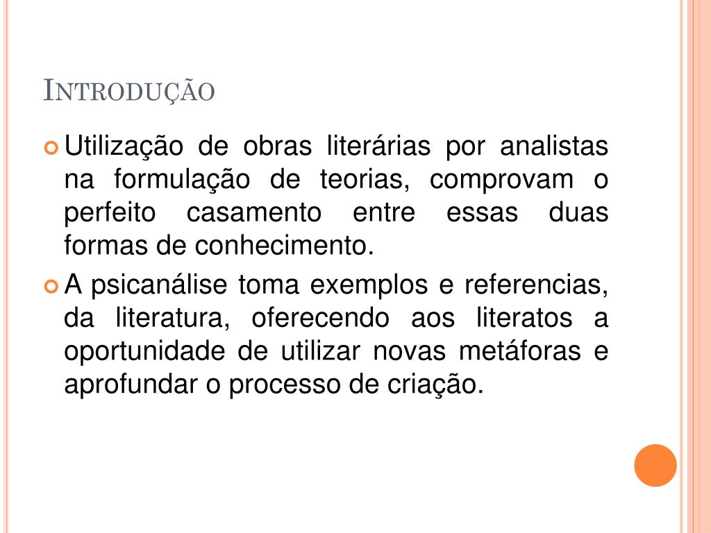 Introdução • Utilização de obras literárias por analistas na formulação de teorias, comprovam o perfeito casamento entre essas duas formas de conhecimento. • A psicanálise toma exemplos e referencias, da literatura, oferecendo aos literatos a oportunidade de utilizar novas metáforas e aprofundar o processo de criação.