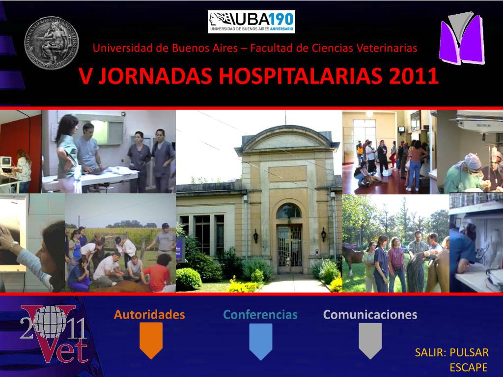 Universidad de Buenos Aires – Facultad de Ciencias Veterinarias. V JORNADAS HOSPITALARIAS 2011. Autoridades . Conferencias. Comunicaciones. SALIR: PULSAR ESCAPE. AUTORIDADES. Marcelo Míguez Decano. Humberto Cisale Vicedecano. DIRECTORA DE LA JORNADA Adriana Duchene
