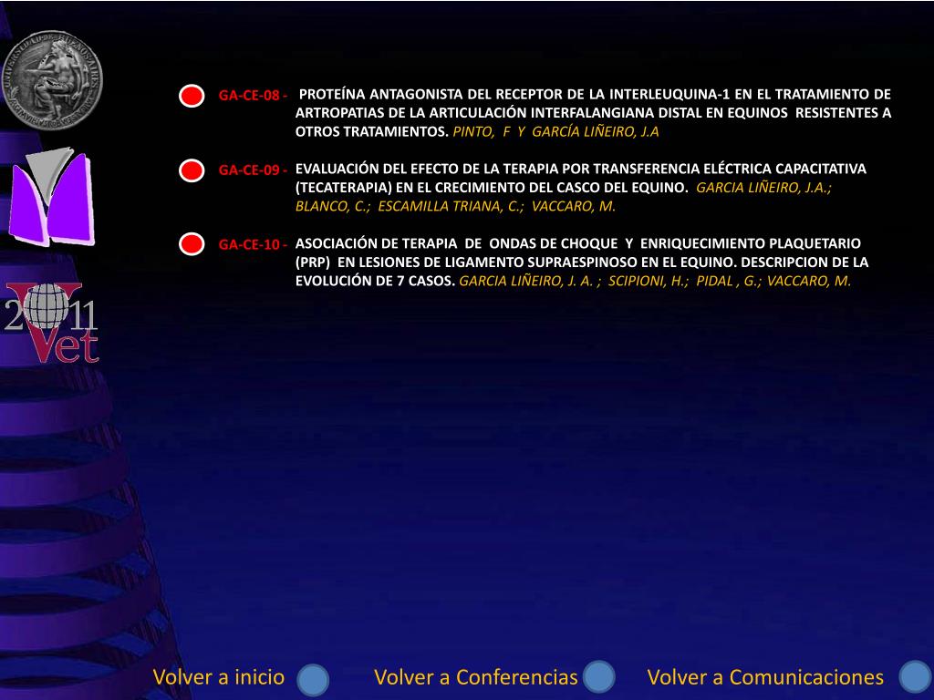 PROTEÍNA ANTAGONISTA DEL RECEPTOR DE LA INTERLEUQUINA-1 EN EL TRATAMIENTO DE ARTROPATIAS DE LA ARTICULACIÓN INTERFALANGIANA DISTAL EN EQUINOS RESISTENTES A OTROS TRATAMIENTOS. PINTO, F Y GARCÍA LIÑEIRO, J.A EVALUACIÓN DEL EFECTO DE LA TERAPIA POR TRANSFERENCIA ELÉCTRICA CAPACITATIVA(TECATERAPIA) EN EL CRECIMIENTO DEL CASCO DEL EQUINO. GARCIA LIÑEIRO, J.A.; BLANCO, C.; ESCAMILLA TRIANA, C.; VACCARO, M. ASOCIACIÓN DE TERAPIA DE ONDAS DE CHOQUE Y ENRIQUECIMIENTO PLAQUETARIO (PRP) EN LESIONES DE LIGAMENTO SUPRAESPINOSO EN EL EQUINO. DESCRIPCION DE LA EVOLUCIÓN DE 7 CASOS. GARCIA LIÑEIRO, J. A. ; SCIPIONI, H.; PIDAL , G.;VACCARO, M. GA-CE-08 - GA-CE-09 - GA-CE-10 - Volver a inicio Volver a Conferencias Volver a Comunicaciones