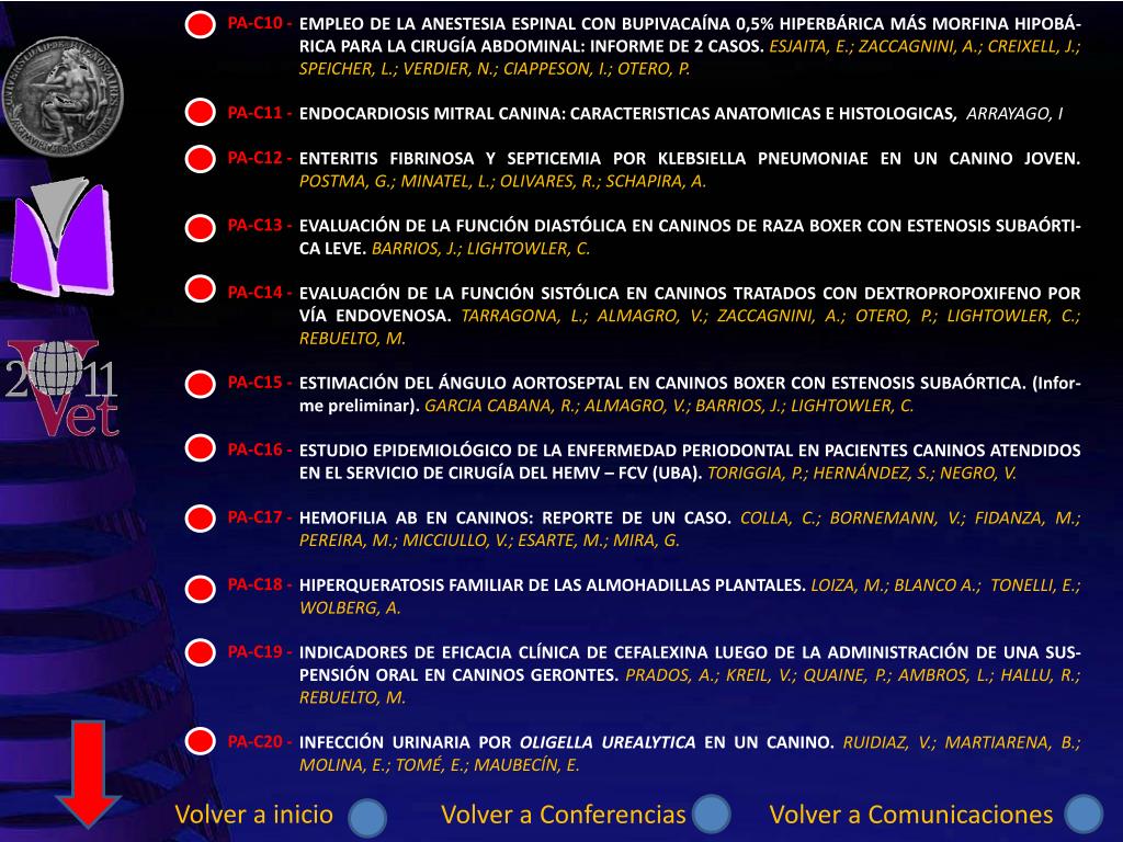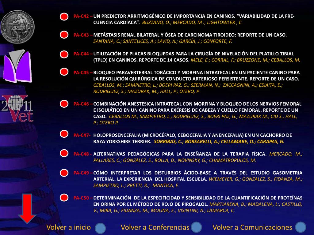 PA-C42 – PA-C43 – PA-C44 – PA-C45 – PA-C46 – PA-C47- PA-C48 - PA-C49 – PA-C50 – UN PREDICTOR ARRITMOGÉNICO DE IMPORTANCIA EN CANINOS. “VARIABILIDAD DE LA FRE-CUENCIA CARDÍACA”. BUZZANO, O.; MERCADO, M .; LIGHTOWLER , C. METÁSTASIS RENAL BILATERAL Y ÓSEA DE CARCINOMA TIROIDEO: REPORTE DE UN CASO. SANTANA, C.; SANTELICES, A.; LAVID, A.; GARCÍA, J.; CONFORTE, F. UTILIZACIÓN DE PLACAS BLOQUEDAS PARA LA CIRUGÍA DE NIVELACIÓN DEL PLATILLO TIBIAL (TPLO) EN CANINOS. REPORTE DE 14 CASOS. MELE, E.; CORRAL, F.; BRUZZONE, M.; CEBALLOS, M. BLOQUEO PARAVERTEBRAL TORÁCICO Y MORFINA INTRATECAL EN UN PACIENTE CANINO PARA LA RESOLUCIÓN QUIRÚRGICA DE CONDUCTO ARTERIOSO PERSISTENTE. REPORTE DE UN CASO. CEBALLOS, M.; SAMPIETRO, L.; BOERI PAZ, G.; SZERMAN, N.; ZACCAGNINI, A.; ESJAITA, E.; RODRIGUEZ, S.; MAZURAK, M., HALL, P.; OTERO, P. COMBINACIÓN ANESTESICA INTRATECAL CON MORFINA Y BLOQUEO DE LOS NERVIOS FEMORAL E ISQUIÁTICO EN UN CANINO PARA EXÉRESIS DE CABEZA Y CUELLO FEMORAL. REPORTE DE UN CASO. CEBALLOS M.; SAMPIETRO, L.; RODRIGUEZ, S., BOERI PAZ, G.; MAZURAK M.; CID S.; HALL, P.; OTERO P. HOLOPROSENCEFALIA (MICROCÉFALO, CEBOCEFALIA Y ANENCEFALIA) EN UN CACHORRO DE RAZA YORKSHIRE TERRIER. SORRIBAS, C.; BORSARELLI, A.; CELLAMARE, O.; CARAPAS, G. ALTERNATIVAS PEDAGÓGICAS PARA LA ENSEÑANZA DE LA TERAPIA FÍSICA. MERCADO, M.; PALLARES, C.; GONZÁLEZ, S.; ROLLA, D.; NOVINSKY, G.; CHAMATROPULOS, M. CÓMO INTERPRETAR LOS DISTURBIOS ÁCIDO-BASE A TRAVÉS DEL ESTUDIO GASOMETRIA ARTERIAL. LA EXPERIENCIA DEL HOSPITAL ESCUELA. WIEMEYER, G.; GONZALEZ, S.; FIDANZA, M.; SAMPIETRO, L.; PRETTI, R.; MANTICA, F. DETERMINACIÓN DE LA ESPECIFICIDAD Y SENSIBILIDAD DE LA CUANTIFICACIÓN DE PROTEÍNAS EN ORINA POR EL MÉTODO DE ROJO DE PIROGALOL. MARTIARENA, B.; MADALENA, L:; CASTILLO, V.; MIRA, G.; FIDANZA, M.; MOLINA, E.; VISINTINI, A.; LAMARCA, C. Volver a inicio Volver a Conferencias Volver a Comunicaciones