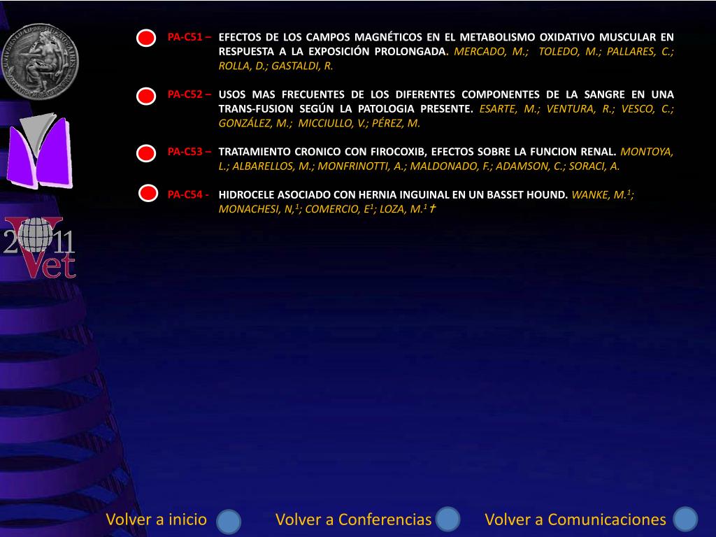 PA-C51 – PA-C52 – PA-C53 – PA-C54 - EFECTOS DE LOS CAMPOS MAGNÉTICOS EN EL METABOLISMO OXIDATIVO MUSCULAR EN RESPUESTA A LA EXPOSICIÓN PROLONGADA. MERCADO, M.; TOLEDO, M.; PALLARES, C.; ROLLA, D.; GASTALDI, R. USOS MAS FRECUENTES DE LOS DIFERENTES COMPONENTES DE LA SANGRE EN UNA TRANS-FUSION SEGÚN LA PATOLOGIA PRESENTE. ESARTE, M.; VENTURA, R.; VESCO, C.; GONZÁLEZ, M.; MICCIULLO, V.; PÉREZ, M. TRATAMIENTO CRONICO CON FIROCOXIB, EFECTOS SOBRE LA FUNCION RENAL. MONTOYA, L.; ALBARELLOS, M.; MONFRINOTTI, A.; MALDONADO, F.; ADAMSON, C.; SORACI, A. HIDROCELE ASOCIADO CON HERNIA INGUINAL EN UN BASSET HOUND. WANKE, M.1; MONACHESI, N,1; COMERCIO, E1; LOZA, M.1 Volver a inicio Volver a Conferencias Volver a Comunicaciones