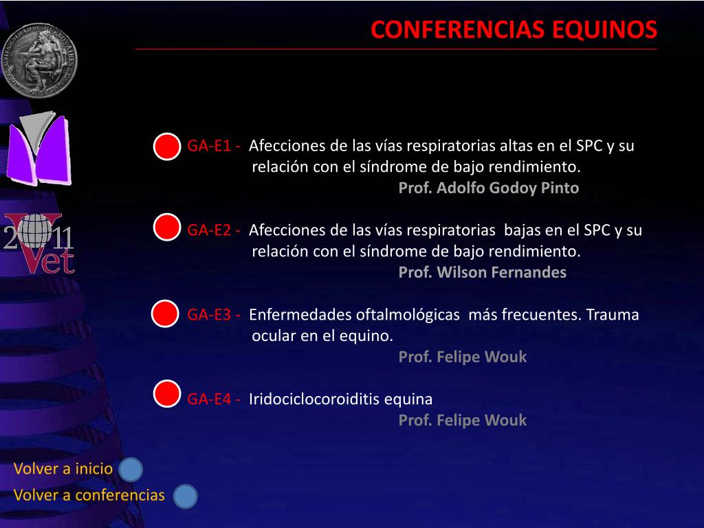 CONFERENCIAS EQUINOS GA-E1 - Afecciones de las vías respiratorias altas en el SPC y su relación con el síndrome de bajo rendimiento. Prof. Adolfo Godoy Pinto GA-E2 - Afecciones de las vías respiratorias bajas en el SPC y su relación con el síndrome de bajo rendimiento. Prof. Wilson Fernandes GA-E3 - Enfermedades oftalmológicas más frecuentes. Trauma ocular en el equino. Prof. Felipe Wouk GA-E4 - Iridociclocoroiditis equina Prof. Felipe Wouk Volver a inicio Volver a conferencias