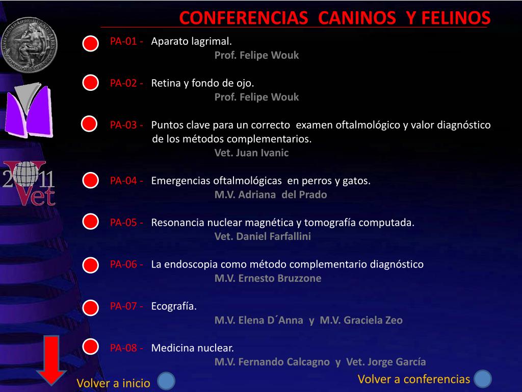 CONFERENCIAS CANINOS Y FELINOS PA-01 - Aparato lagrimal. Prof. Felipe Wouk PA-02 - Retina y fondo de ojo. Prof. Felipe Wouk PA-03 - Puntos clave para un correcto examen oftalmológico y valor diagnóstico de los métodos complementarios. Vet. Juan Ivanic PA-04 - Emergencias oftalmológicas en perros y gatos. M.V. Adriana del Prado PA-05 - Resonancia nuclear magnética y tomografía computada. Vet. Daniel Farfallini PA-06 - La endoscopia como método complementario diagnóstico M.V. Ernesto Bruzzone PA-07 - Ecografía. M.V. Elena D´Anna y M.V. Graciela Zeo PA-08 - Medicina nuclear. M.V. Fernando Calcagno y Vet. Jorge García Volver a conferencias Volver a inicio
