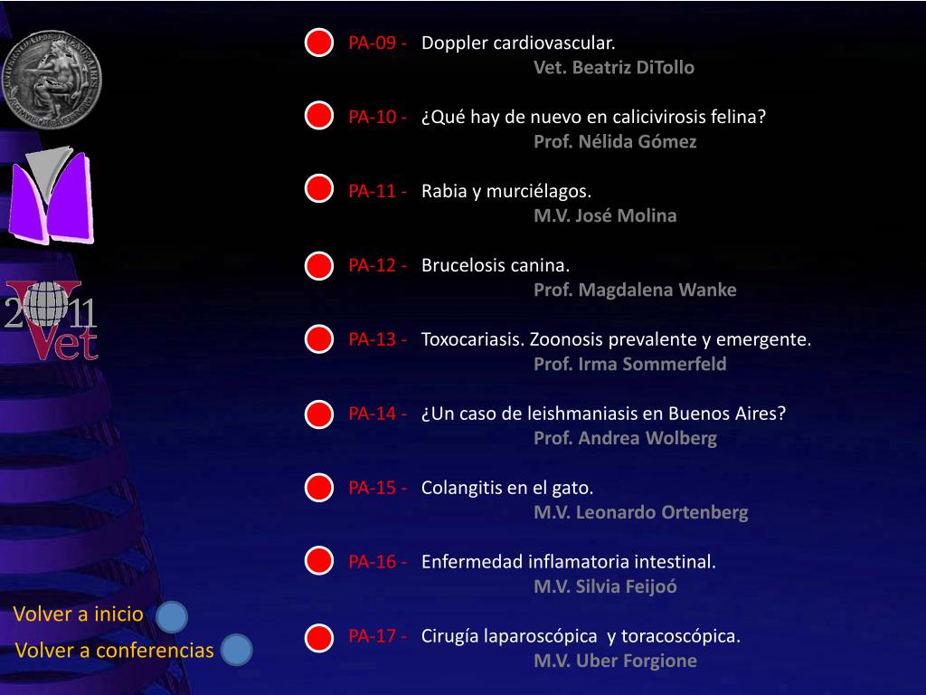PA-09 - Doppler cardiovascular. Vet. Beatriz DiTollo PA-10 - ¿Qué hay de nuevo en calicivirosis felina? Prof. Nélida Gómez PA-11 - Rabia y murciélagos. M.V. José Molina PA-12 - Brucelosis canina. Prof. Magdalena Wanke PA-13 - Toxocariasis. Zoonosis prevalente y emergente. Prof. Irma Sommerfeld PA-14 - ¿Un caso de leishmaniasis en Buenos Aires? Prof. Andrea Wolberg PA-15 - Colangitis en el gato. M.V. Leonardo Ortenberg PA-16 - Enfermedad inflamatoria intestinal. M.V. Silvia Feijoó PA-17 - Cirugía laparoscópica y toracoscópica. M.V. UberForgione Volver a inicio Volver a conferencias