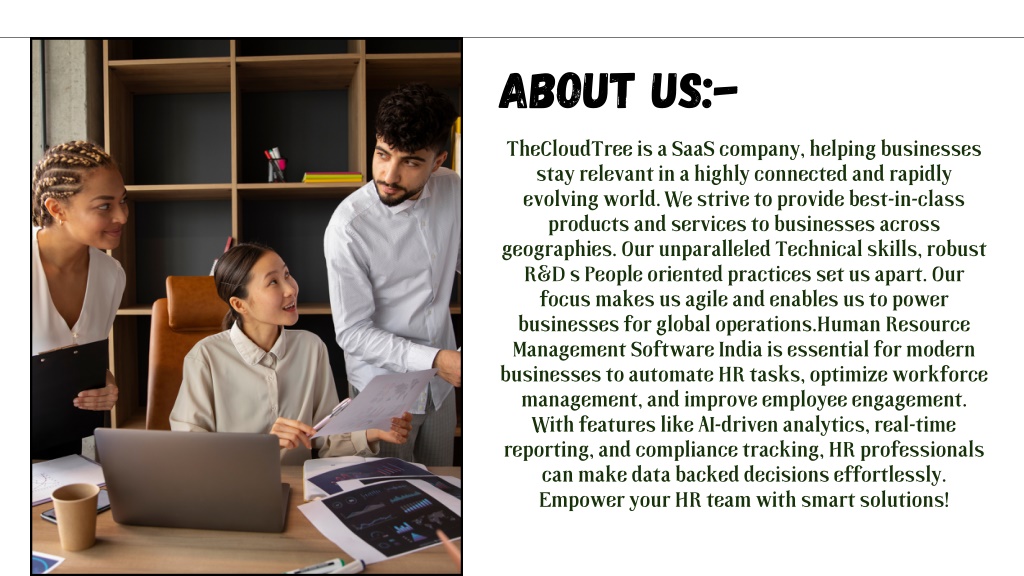 2. About us:- TheCloudTree is a SaaS company, helping businesses stay relevant in a highly connected and rapidly evolving world. We strive to provide best-in-class products and services to businesses across geographies. Our unparalleled Technical skills, robust R&D s People oriented practices set us apart. Our focus makes us agile and enables us to power businesses for global operations.Human Resource Management Software India is essential for modern businesses to automate HR tasks, optimize workforce management, and improve employee engagement. With features like AI-driven analytics, real-time reporting, and compliance tracking, HR professionals can make data backed decisions effortlessly. Empower your HR team with smart solutions!