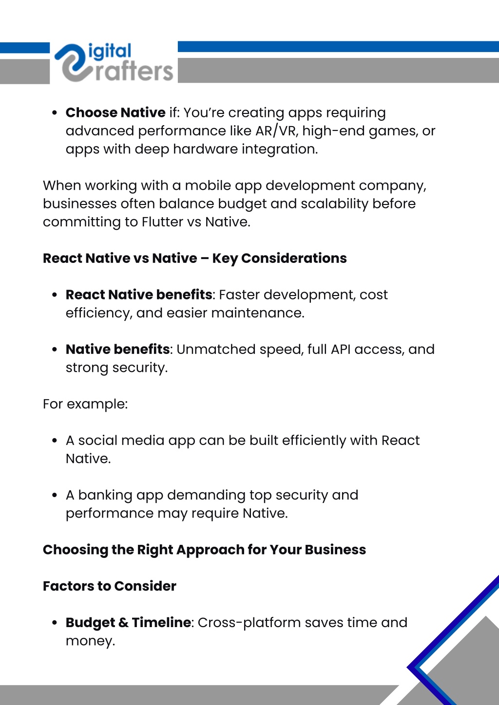 Choose Native if: You’re creating apps requiring advanced performance like AR/VR, high-end games, or apps with deep hardware integration. When working with a mobile app development company, businesses often balance budget and scalability before committing to Flutter vs Native. React Native vs Native – Key Considerations React Native benefits: Faster development, cost efficiency, and easier maintenance. Native benefits: Unmatched speed, full API access, and strong security. For example: A social media app can be built efficiently with React Native. A banking app demanding top security and performance may require Native. Choosing the Right Approach for Your Business Factors to Consider Budget & Timeline: Cross-platform saves time and money.