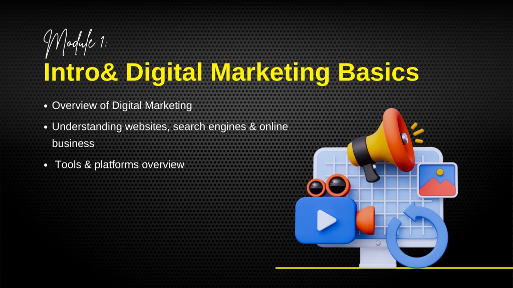 Module 1: Intro& Digital Marketing Basics Overview of Digital Marketing Understanding websites, search engines & online business Tools & platforms overview