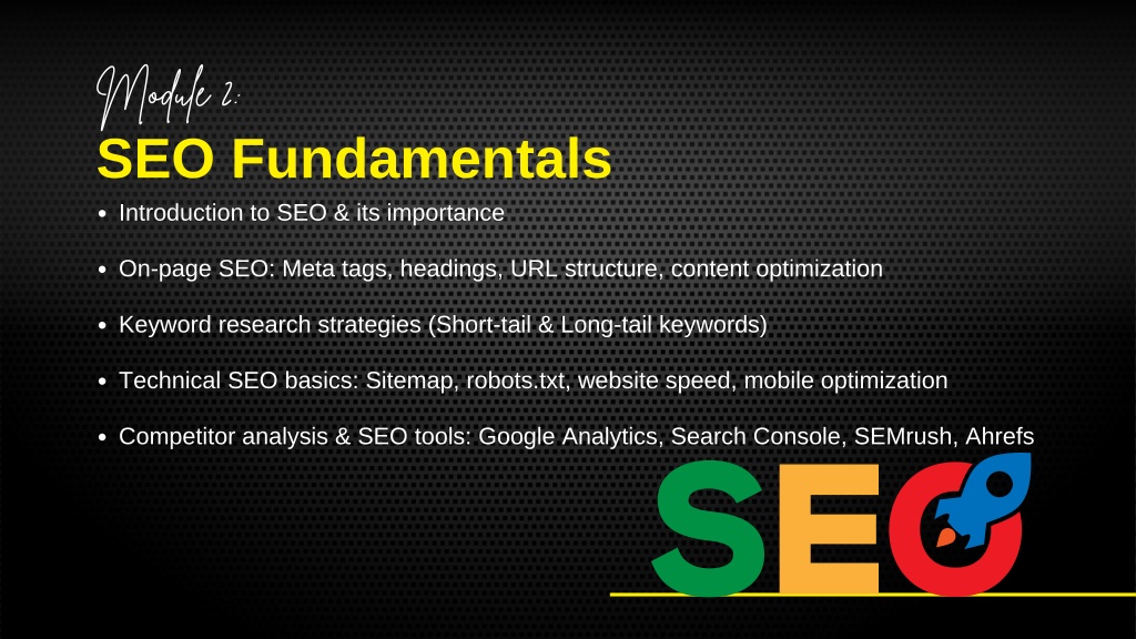 Module 2: SEOFundamentals Introduction to SEO & its importance On-page SEO: Meta tags, headings, URL structure, content optimization Keyword research strategies (Short-tail & Long-tail keywords) Technical SEO basics: Sitemap, robots.txt, website speed, mobile optimization Competitor analysis & SEO tools: Google Analytics, Search Console, SEMrush, Ahrefs